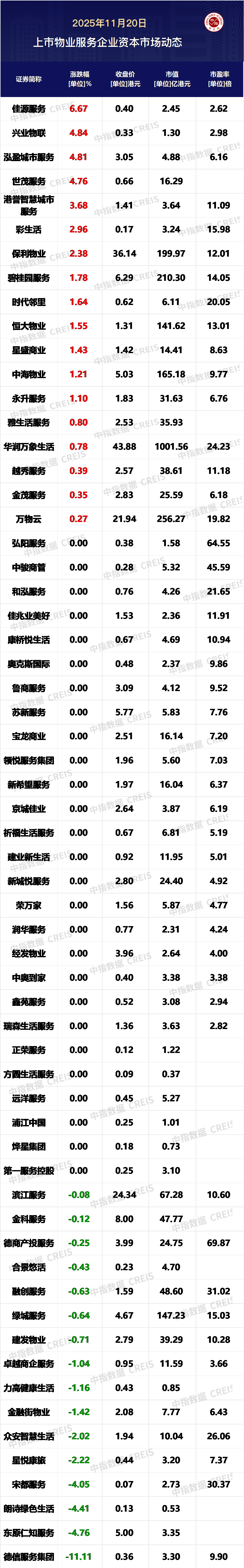 11月20日,恒生指数,收盘上涨4.92点,涨幅约为0.02%,报收25835.57点。今日61家港股上市物业服务企业中18家上涨。佳源服务涨幅为6.67%,位列今日港股物业服务板块第一位。